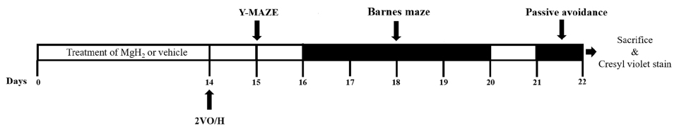 實驗人員,將這 32 隻大鼠隨機分配成四組,首先是 SO 組作為偽對照組(Sham Control Group),SO 組的大鼠注射一般生理食鹽水;VEH 組則是對照組(Control Group),透過人為的方式使大鼠產生低血容量的血管性失智動物模型;MH-L 組用同樣的方式使大鼠產血管性失智但在之前會讓大鼠連續口服低劑量氫化鎂(MgH2) 14 天,劑量濃度為 5mg/kg;MH-H 組與 MH-L 相同,只有口服氫化鎂(MgH2)的劑量較高,濃度為 15mg/kg。